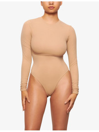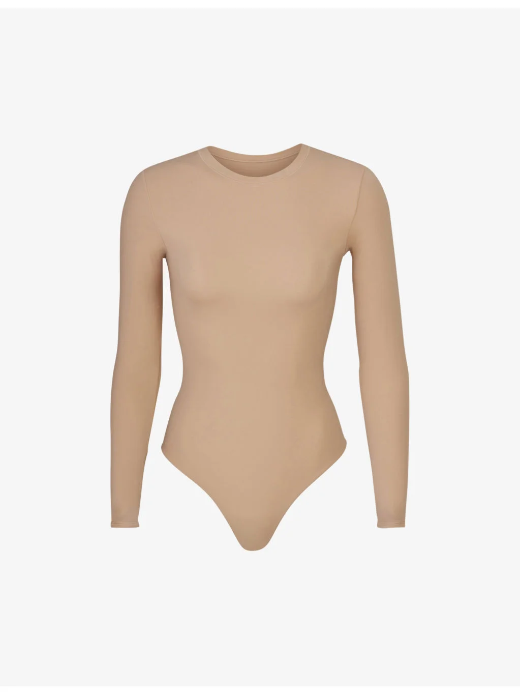 PRODUCT DETAILS - SKIMS stretch-woven body - 76% polyamide, 24% elastane - Snap fastening - Fitted, long sleeves, round neck, thong back - Machine wash cold - Lightweight, stretchy