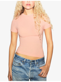 PRODUCT DETAILS - SKIMS jersey T-shirt - 76% polyamide, 24% elastane - Slips on - Slim fit, round neck, short sleeves, jersey texture - Machine wash cold - True to size - Model is 5ft 9in/1.75m and wears a size small - Lightweight, stretchy Ref: R04428561