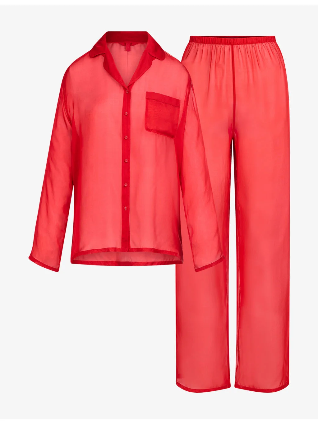 PRODUCT DETAILS - SKIMS silk set - 100% silk - Button fastening - Top: camp collar, long sleeves, one patch pocket at chest, all-over sheer fabric - Bottoms: relaxed fit, mid-rise, loose leg, elasticated waistband, sheer fabric - Hand wash - True to size - Model is 5ft 9in/1.75m and wears a size small - Lightweight, non-stretch Ref: R04538124