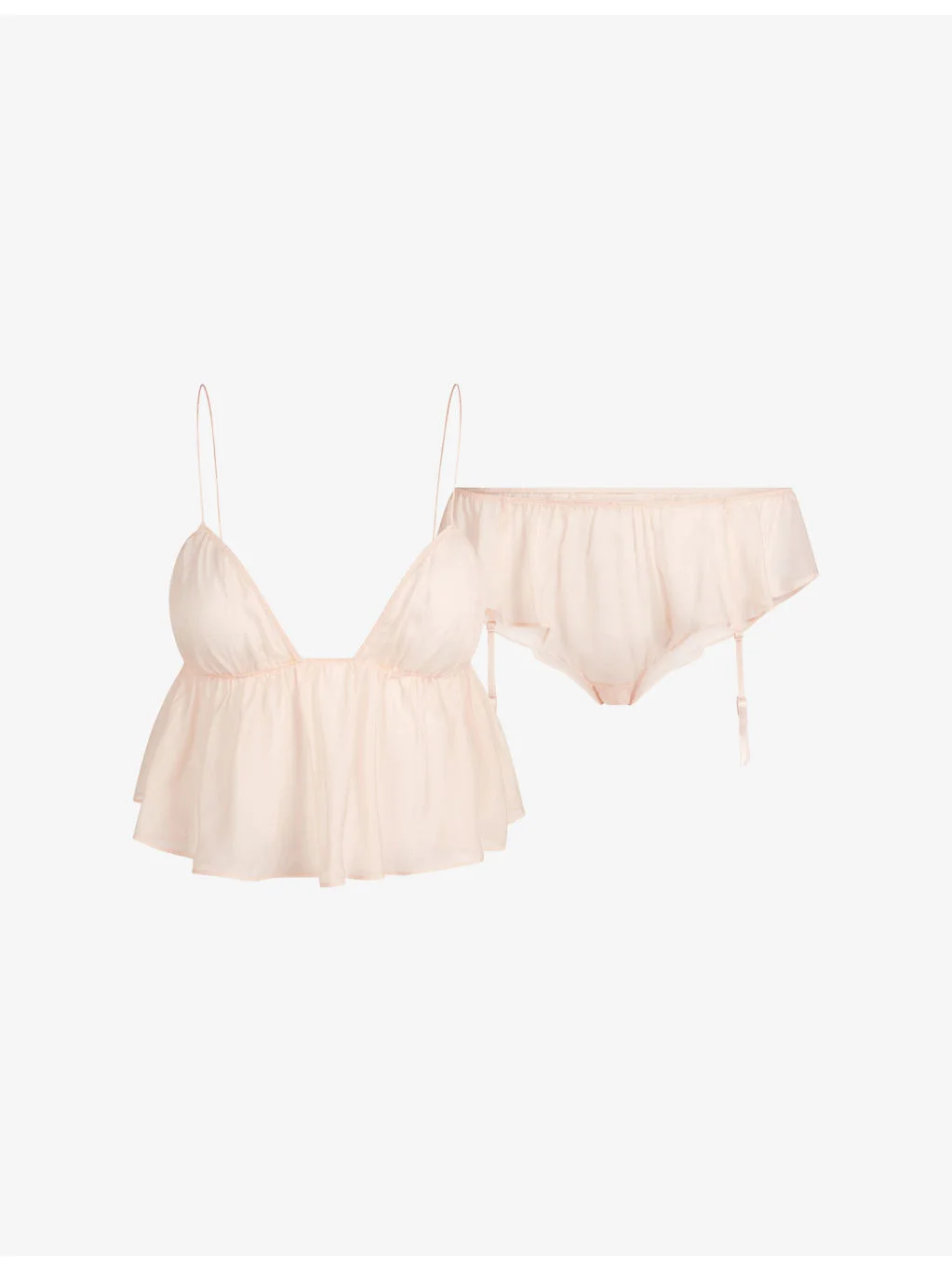 PRODUCT DETAILS - SKIMS silk set - 100% silk - Top: regular fit, micro triangle neckline, adjustable rouleau straps, unlined cups, cropped - Garter: regular fit, low-rise, flutter leg opening, removable garter straps - Hand wash cold - True to size - Lightweight, non-stretch - For hygiene reasons, we are unable to exchange or refund this product, unless faulty. Ref: R04572146