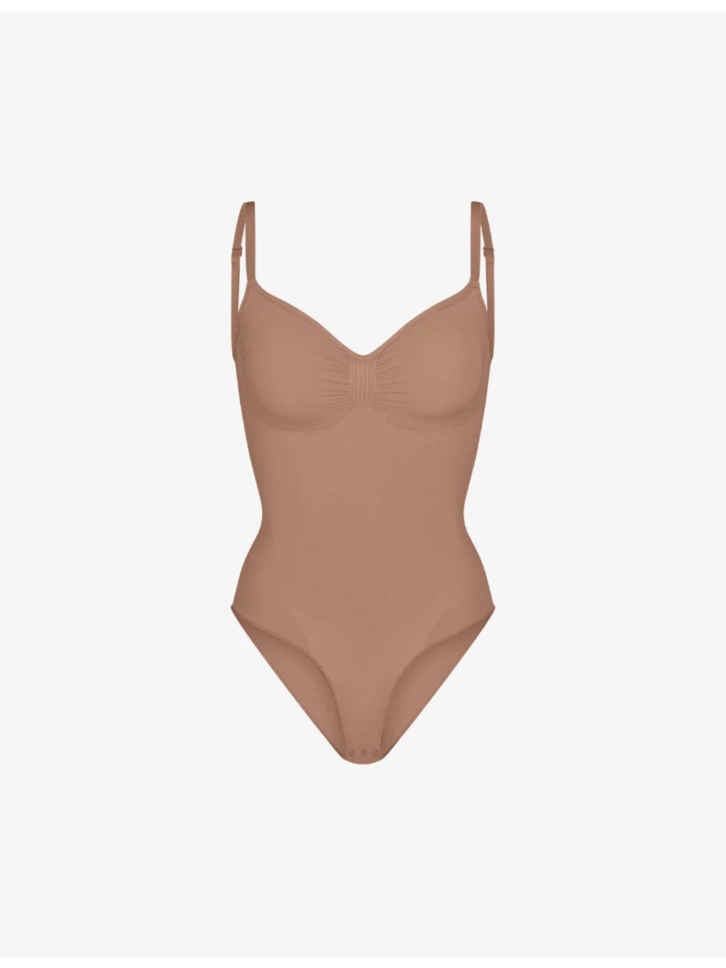 PRODUCT DETAILS - SKIMS stretch-woven body - 41% nylon, 41% recycled nylon, 18% elastane - Snap fastening - Fitted, seamless, scoop neck, ruched detail, adjustable straps - Machine wash cold - True to size - Lightweight, stretchy