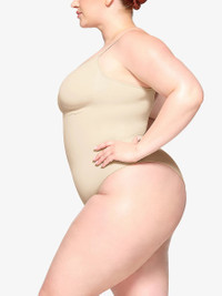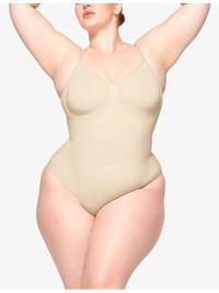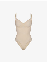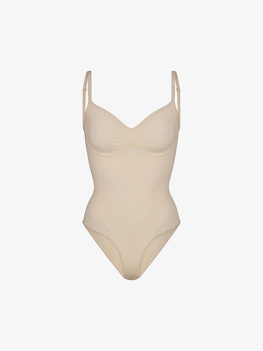 PRODUCT DETAILS - SKIMS stretch-woven body - 41% nylon, 41% recycled nylon, 18% elastane - Snap fastening - Fitted, seamless, scoop neck, ruched detail, adjustable straps - Machine wash cold - True to size - Lightweight, stretchy