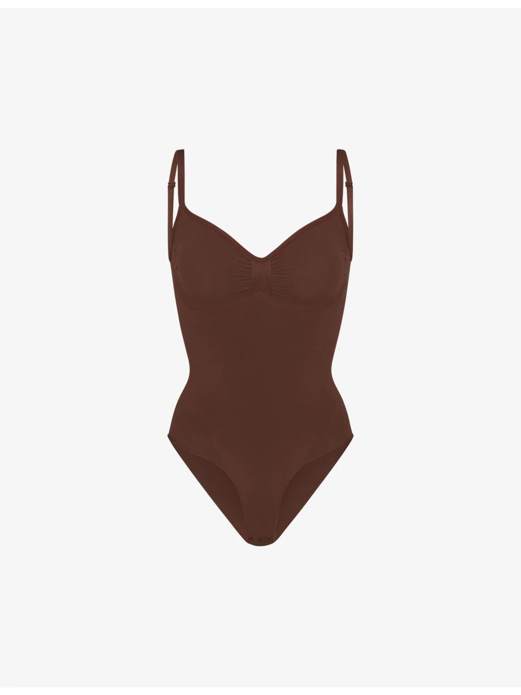 PRODUCT DETAILS - SKIMS stretch-woven body - 82% nylon, 18% elastane - Snap fastening - Fitted, seamless, scoop neck, ruched detail, adjustable straps - Machine wash cold - True to size - Lightweight, stretchy Ref: R04134829