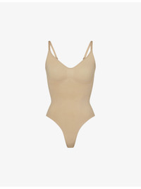 PRODUCT DETAILS - SKIMS fitted stretch-woven body - 82% nylon, 18% elastane - Slips on - Fitted, V-neck, sleeveless, ruched panel, low back - Hand wash cold - True to size - Lightweight, stretchy Ref: R04217492