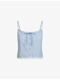 PRODUCT DETAILS - Skims cotton cami top - 96% cotton, 4% elastane - Exposed button fastening at front - Adjustable straps, self-tie bow at front, curved neckline, sleeveless, lace trim, straight hem - Machine wash cold - True to size - Model is 5ft 10in/1.78m and wears a size small - Lightweight, non-stretch Ref: R04468868