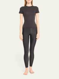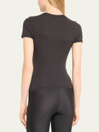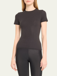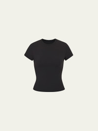 SKIMS body-hugging t-shirt Crew neckline Short sleeves Formfitting Pullover style Nylon/polyamide/spandex Imported Model is 5'10"/177cm. Online Inquiries: BGS21_I2K21| Store Inquiries: #4701877