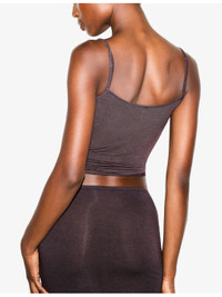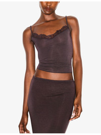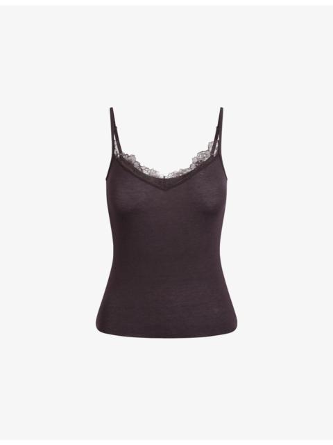 PRODUCT DETAILS - SKIMS modal and cashmere-blend camisole top - 84% modal, 10% cashmere, 6% elastane - Slim fit, scoop neck, adjustable spaghetti straps, floral lace embroidery, sheer finish - Machine wash cold - True to size - Model is 5ft 10in/1.78m and wears a size small - Lightweight, slight stretch Ref: R04538115