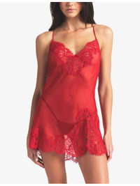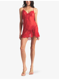 PRODUCT DETAILS - SKIMS silk mini slip dress - 100% silk; contrast 100% nylon - V-neck, convertible, adjustable straps, semi-sheer, side slit, scalloped lace trims, mini length - Hand wash - True to size - Lightweight, non-stretch Ref: R04538092