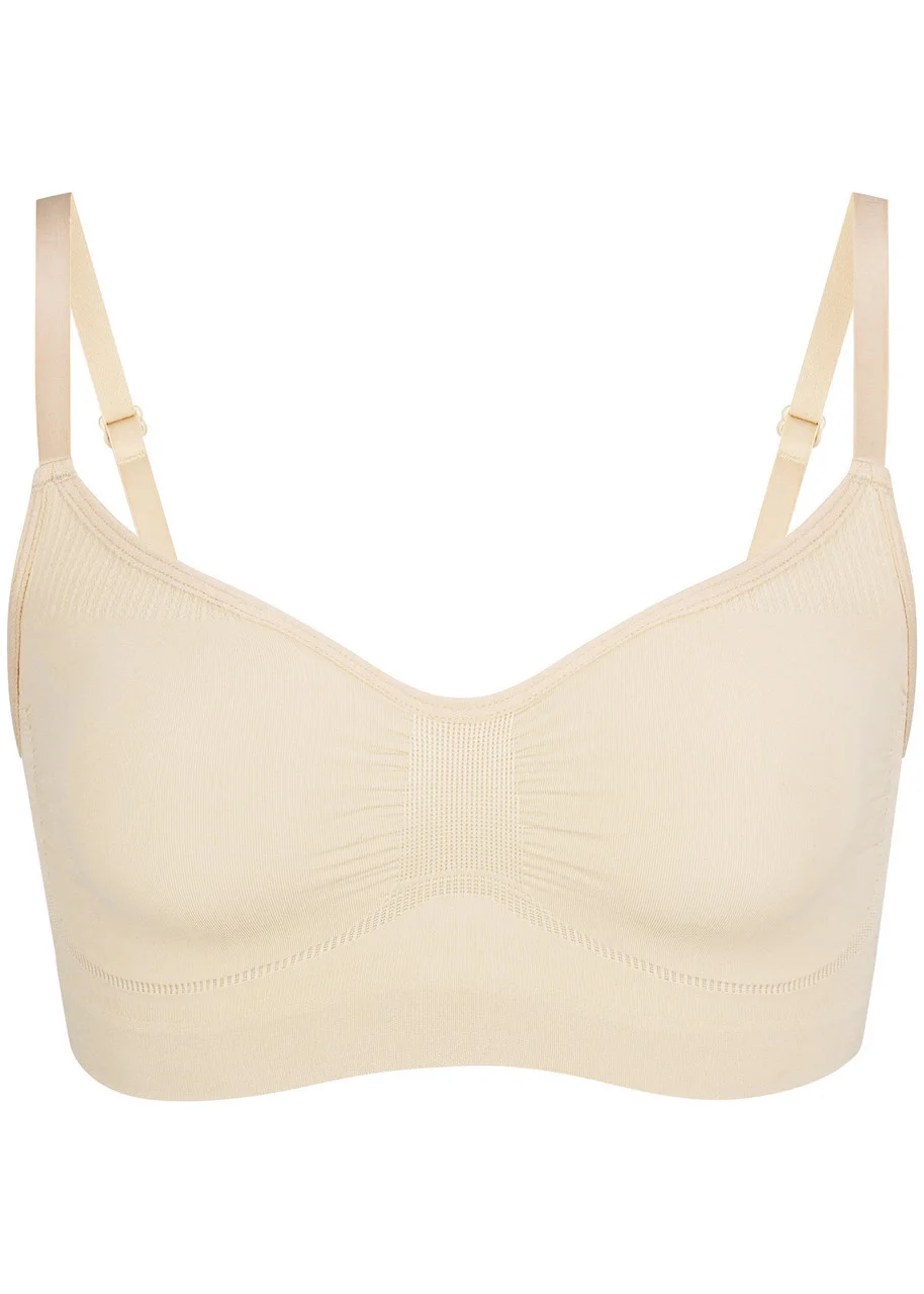 Style Notes Skim's signature;seamless sculpting bralette contours your curves with pique stitching along the front and sides that flatters and defines the bust while offering ultra-strong support. Features a scoop front and adjustable straps for your best fit. Info & Care Skims seamless sculpt bralette Part of the Seamless Sculpt collection Scoop-neck, adjustable straps, pique stitching along centre front and sides Pull on (no hook and eye) 82% nylon, 18% elastane Machine wash cold