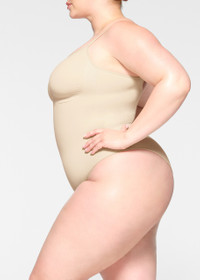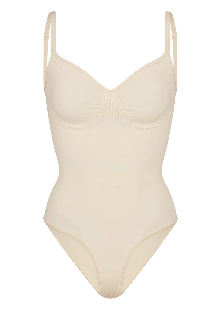 Style Notes Skim's signature;sculpting bodysuit, updated for an even better fit. This figure-enhancing style has extra compression at the core and waist, perfectly placed style lines that flatter your bust, and rounded bottom pockets for a lifted look. Features adjustable straps, a wide crotch for added coverage, and a cotton gusset with snap closure. Info & Care Skims seamless sculpt bodysuit Part of the Seamless Sculpt collection Scoop-neck, adjustable straps, strong compression along tummy and waist, wide gusset for added coverage, pockets at bottom to lift, brief back, 100% cotton gusset Snap closure 82% nylon, 18% elastane Machine wash cold Size & Fit Close fit