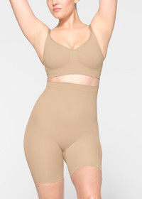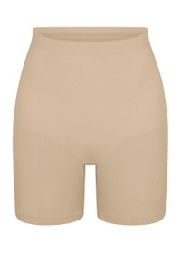 Style Notes With its strong tummy and waist control and extra compression along the back thighs for a lifted look, Skim's signature smoothing solution contours for your ultimate layer of confidence under it all. Features large round bottom pockets for definition, an interior silicone underband to prevent rolling, and an open gusset. Info & Care Skims stretch-jersey shorts Part of the Seamless Sculpt collection Interior silicone band to prevent rolling, strong compression along tummy, waist and thighs, pockets at bottom, strong compression along back thigh to lift, hits at mid thigh, open gusset 82% nylon, 18% elastane Machine wash cold