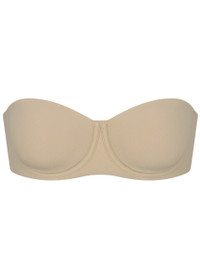 Style Notes A soft strapless solution with;a hidden cushion underwire that supports and shapes your bust but never digs into your skin. Features removable, adjustable straps that can be worn multiple ways, silicone tape along the 2-ply wings to keep it in place, and a hook and eye back closure. Info & Care Skims strapless bra Part of the Fits Everybody collection Strapless, molded lightly lined cups, silicone tape along neckline and wing, removable adjustable straps that can be worn multiple ways, comfortable hidden cushion underwire, 2 ply wing Hook and eye back closure 76% polyamide, 24% elastane Machine wash cold