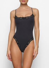 Style Notes Buttery-soft and ultra-flattering, this stretchy lace trim bodysuit is perfect for daily wear. Features a scoop front neckline, adjustable straps, and a 100% cotton gusset with snap closure. Info & Care Skims;stretch-jersey bodysuit Part of the Fits Everybody Lace collection Scoop-neck, adjustable straps, stretchy lace trim along front and back neck, under arm and leg opening, 100% Cotton gusset Snap closure at gusset 76% polyamide, 24% elastane Machine wash cold Size & Fit Close fit