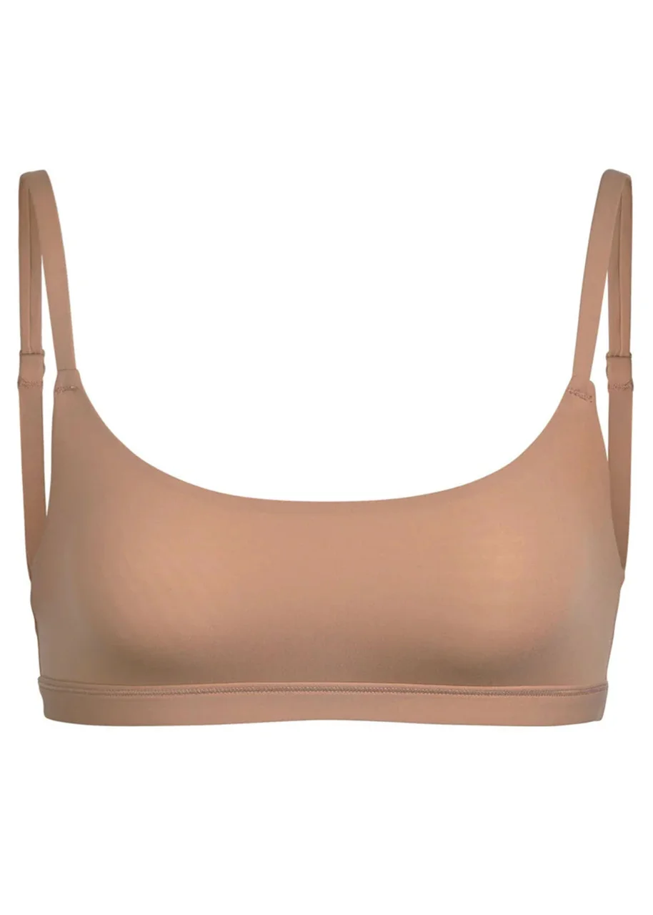 Style Notes With its buttery-soft fabric and flattering fit, this stretchy pullover bralette molds to and supports your bust while feeling light and comfortable. The second-skin design prevents digging and ensures a smooth look under clothing. Features a scoop neck and adjustable shoulder straps. Info & Care Skims stretch-jersey bralette Part of the Fits Everybody collection Adjustable straps, shelf-bralette style, encased elastic underbust seam Pullover style 76% polyamide, 24% elastane Machine wash cold