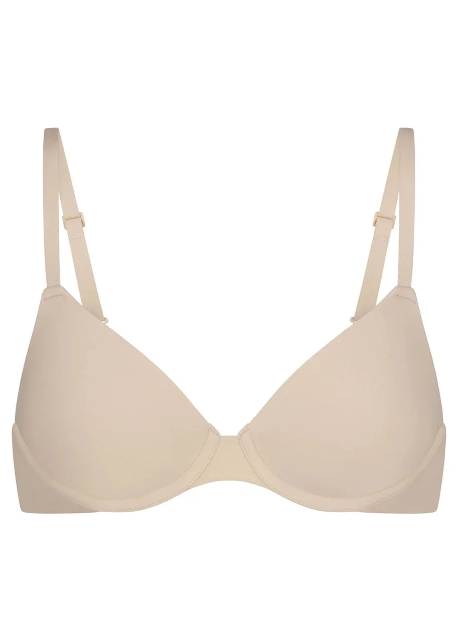 Style Notes This classic foundation with demi coverage has 360-stretch technology for a custom-made fit even when you're between sizes. Made from Skims signature soft fabric with a second-skin feel that makes you forget you're wearing a bra. Offers unparalleled support with its lightly lined cups and flexible underwire that doesn't dig. Features adjustable straps and a hook and eye closure in the back. Info & Care Skims stretch-jersey T-shirt bra Part of the Fits Everybody collection Molded demi coverage, lightly lined cups, adjustable straps, flexible underwire for support, 360 stretch comfort to fit in between sizes Hook and eye fastening 76% polyamide, 24% elastane Machine wash cold