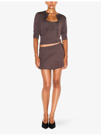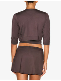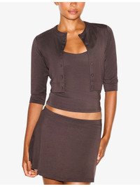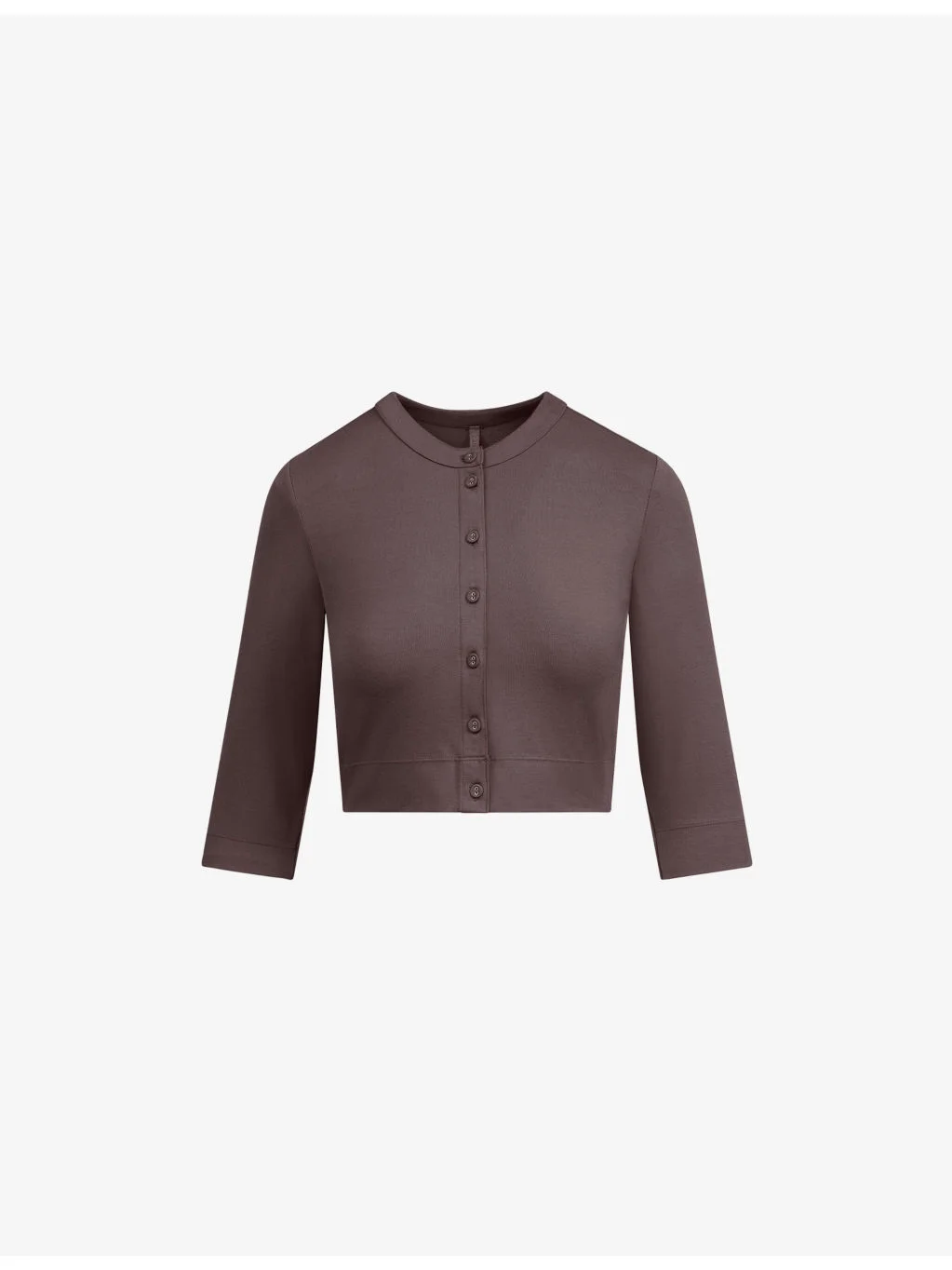 PRODUCT DETAILS - SKIMS stretch-modal cardigan - 93% modal, 7% elastane - Exposed button fastenings at front - Slim fit, crewneck, three-quarter length sleeves, cropped design - Machine wash cold - True to size - Model is 5ft 10in/1.78m and wears a size small - Lightweight, stretchy Ref: R04501724