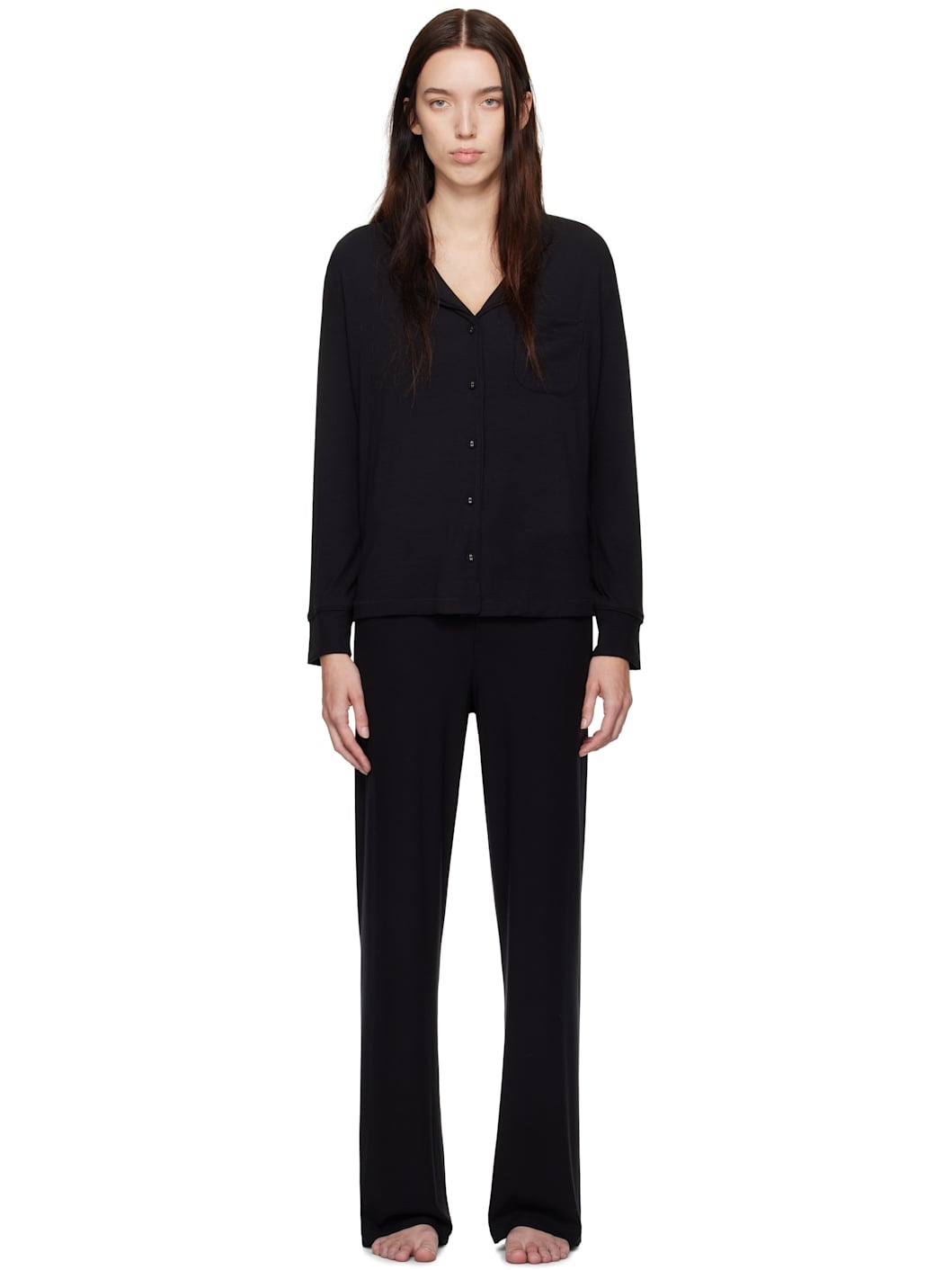 Breathable and lightweight stretch modal ribbed jersey pyjama shirt. · Open spread collar · Button closure · Patch pocket at chest Breathable and lightweight stretch modal ribbed jersey pyjama pants. Concealed drawstring at elasticized waistband. Supplier color: Onyx 91% modal, 9% spandex. Made in China 251545F079000