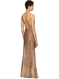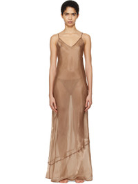 Semi-sheer polyester organza maxi dress. · V-neck · Godet panel at hem · Adjustable spaghetti straps · Low back · Unlined Supplier color: Sienna 100% polyester. Made in Viet Nam 251545F055006