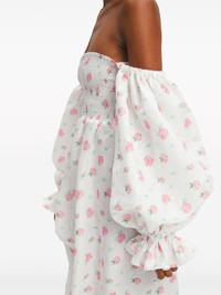 Atlanta rose-print linen dress Highlights - White/pink - Linen - Rose print - Floral applique - Smocked panel - Off-shoulder - Long puff sleeves - Draped design - Asymmetric hem Imported Composition Linen/Flax 100%