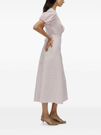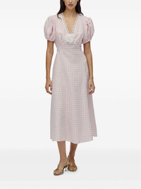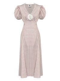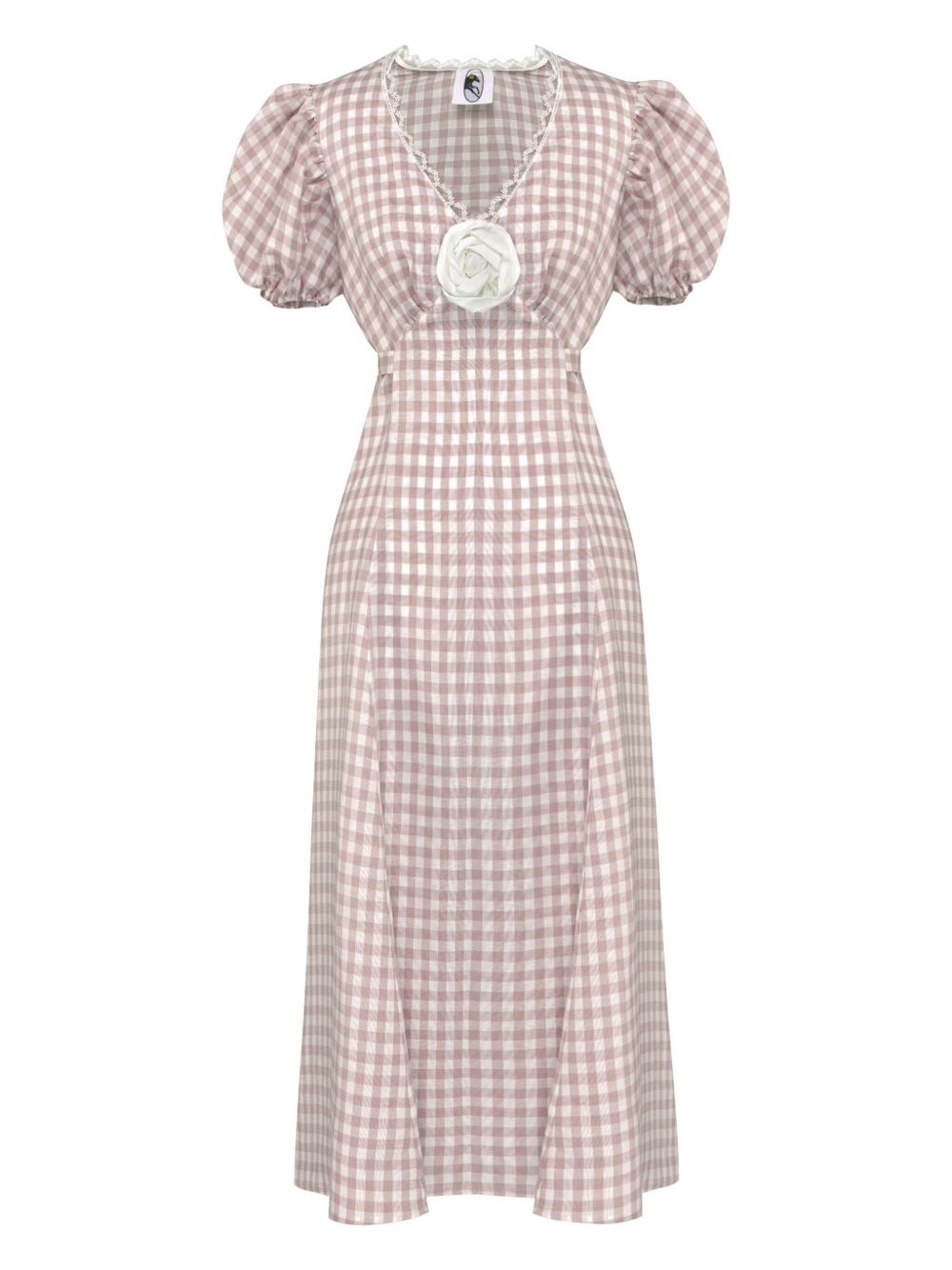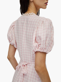 Genus dress Highlights - Light pink - Floral applique - Lace trim - Plunging v-neck - Short puff sleeves Imported Composition Cotton 100%, Linen/Flax 100%