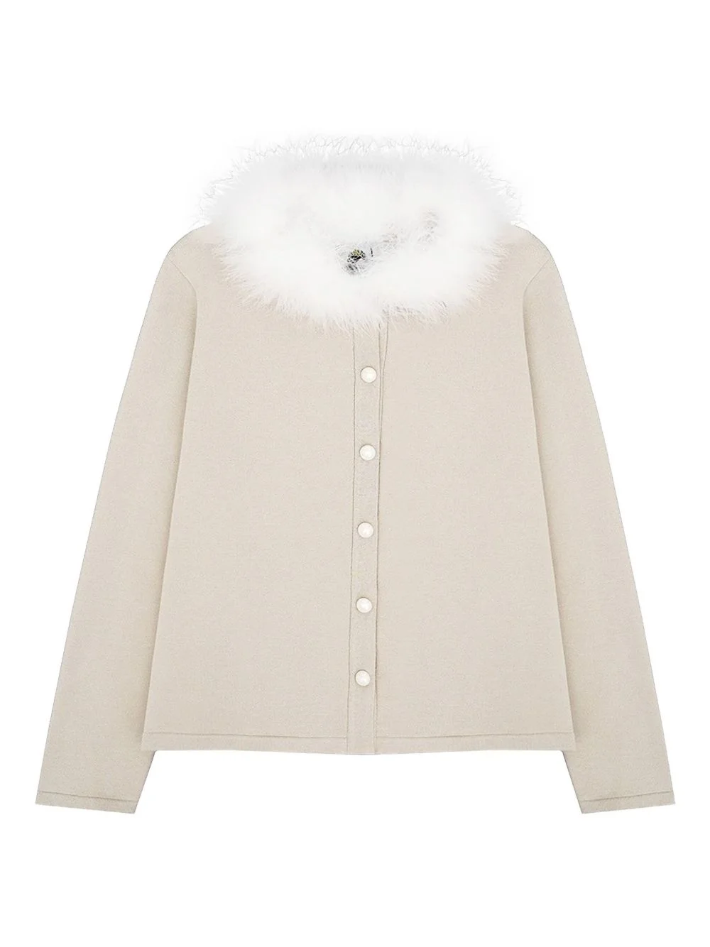 Miss Kitty cardigan Highlights - Beige - Feather collar - Front button fastening - Round neck - Long sleeves - Ribbed trim Imported Composition Outer: Turkey Feather 100%, Viscose 70%, Polyester 30% Washing instructions Read Manufacturer Guidelines