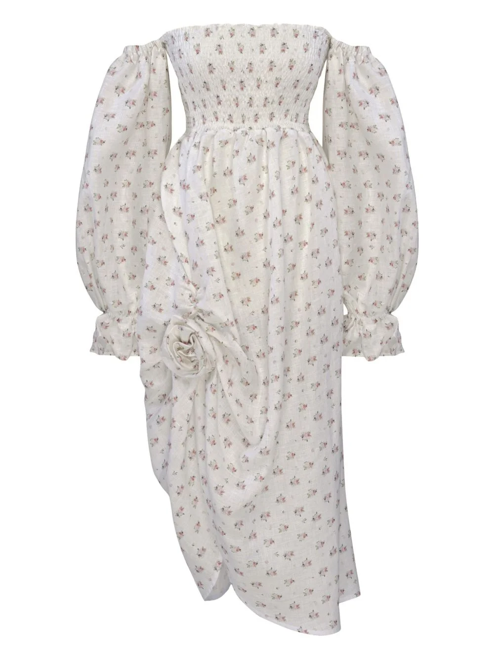 off-shoulder midi dress Highlights - White - All-over floral print - Front slit - Long sleeves - Mid-length Imported Composition Organic Linen 100%