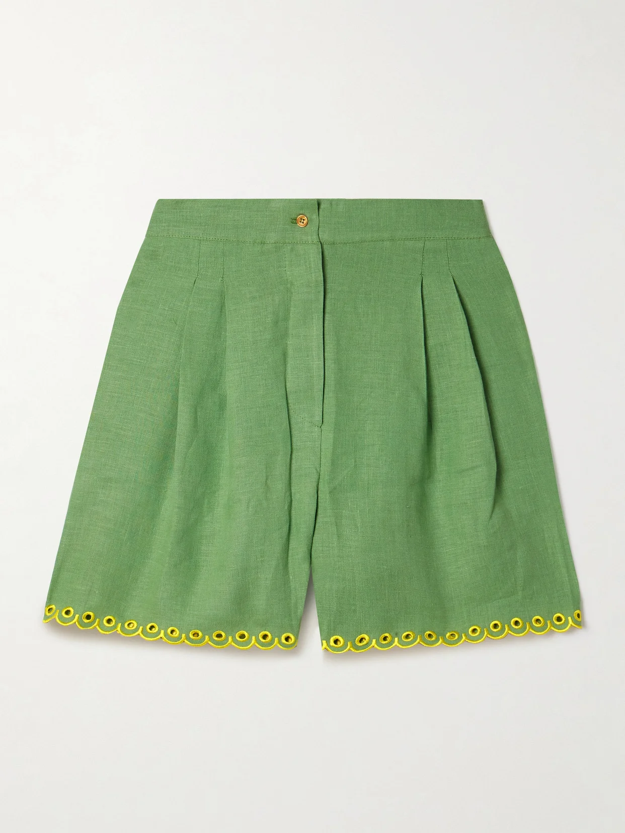 Sleeper's 'Petra' pajama shorts have a smart, tailored design, making them just as suitable for everyday wear. Part of a set with the coordinating shirt, they're cut from green linen that's pleated to relax the legs and have yellow broderie anglaise outlining the scalloped hems. The partially elasticated waistband ensures the perfect fit.