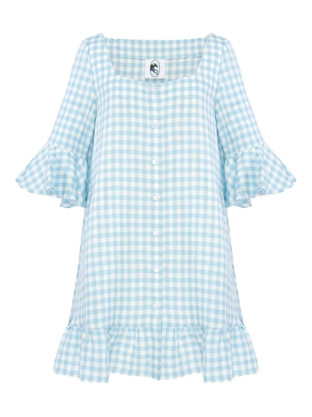 plaid-print mini-dress Highlights - Light blue - White - Scoop neck - Button fastenings - Flared sleeves - Ruffled hem Imported Composition Linen/Flax 50%, Viscose 50% Washing instructions Dry Clean Only