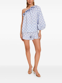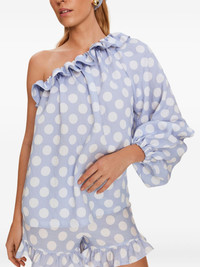 polka-dot blouse Highlights - Blue - Polka dot print - Single long sleeve - One-shoulder Imported Composition Viscose 83%, Nylon 17% Washing instructions Read Manufacturer Guidelines