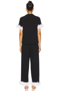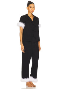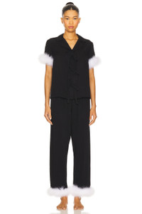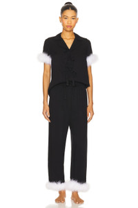- Self: 100% viscose Contrast Fabric: 100% turkey feathers - Spot clan only - Front tie closures and pull-on styling - Elasticized waistband - Notched lapel collar - Turkey feather trim - Midweight soft jersey fabric - Sold as a set - Revolve Style No. SEPE-WI36 - Manufacturer Style No. POSP02P002F
