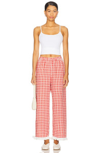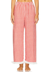- Self: 50% linen 50% viscose Contrast Fabric: 100% linen - Dry clean only - Pull-on styling with elastic waistband - Midweight linen fabric with ruffled trim - Item not sold as set.21" at the knee narrows to 19" at the leg opening - Revolve Style No. SEPE-WI34 - Manufacturer Style No. PFPT01G015R