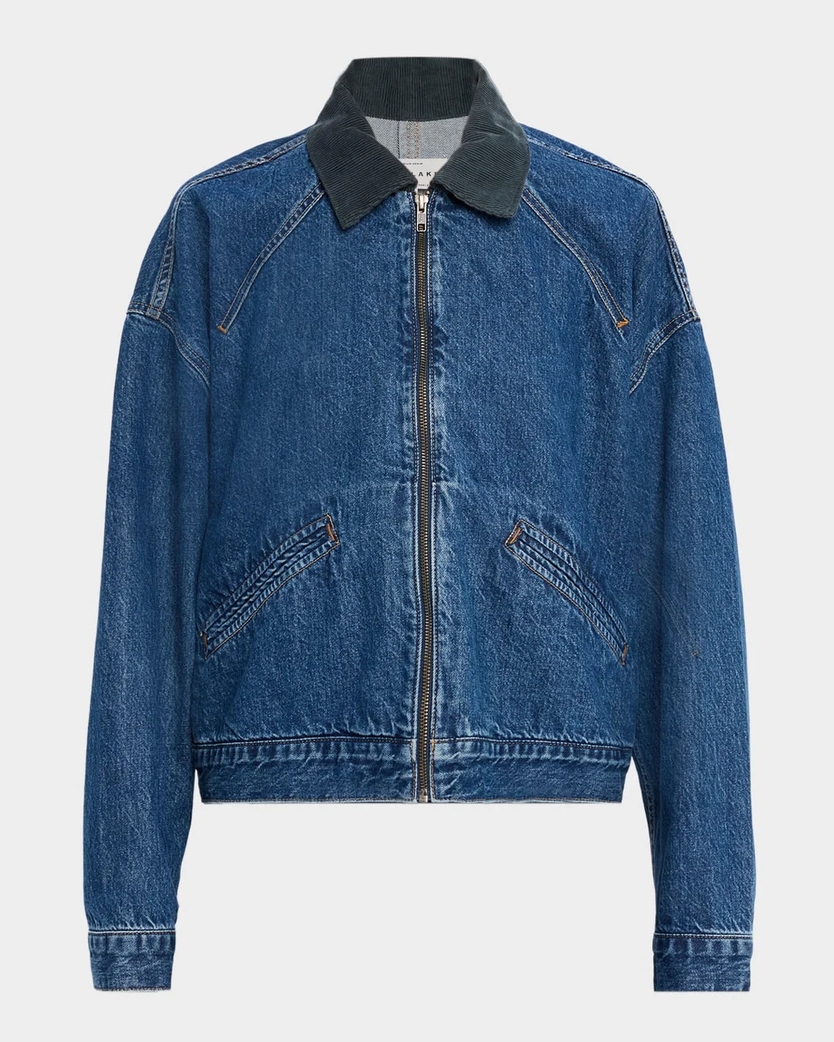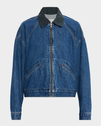 SLVRLAKE "Camden" denim garage jacket elevated with a corduroy collar Spread collar Dropped shoulders Long sleeves with button cuffs Zip pockets Relaxed fit Hem falls to the hip Zipfront Cotton Machine wash cold Made in USA from imported materials