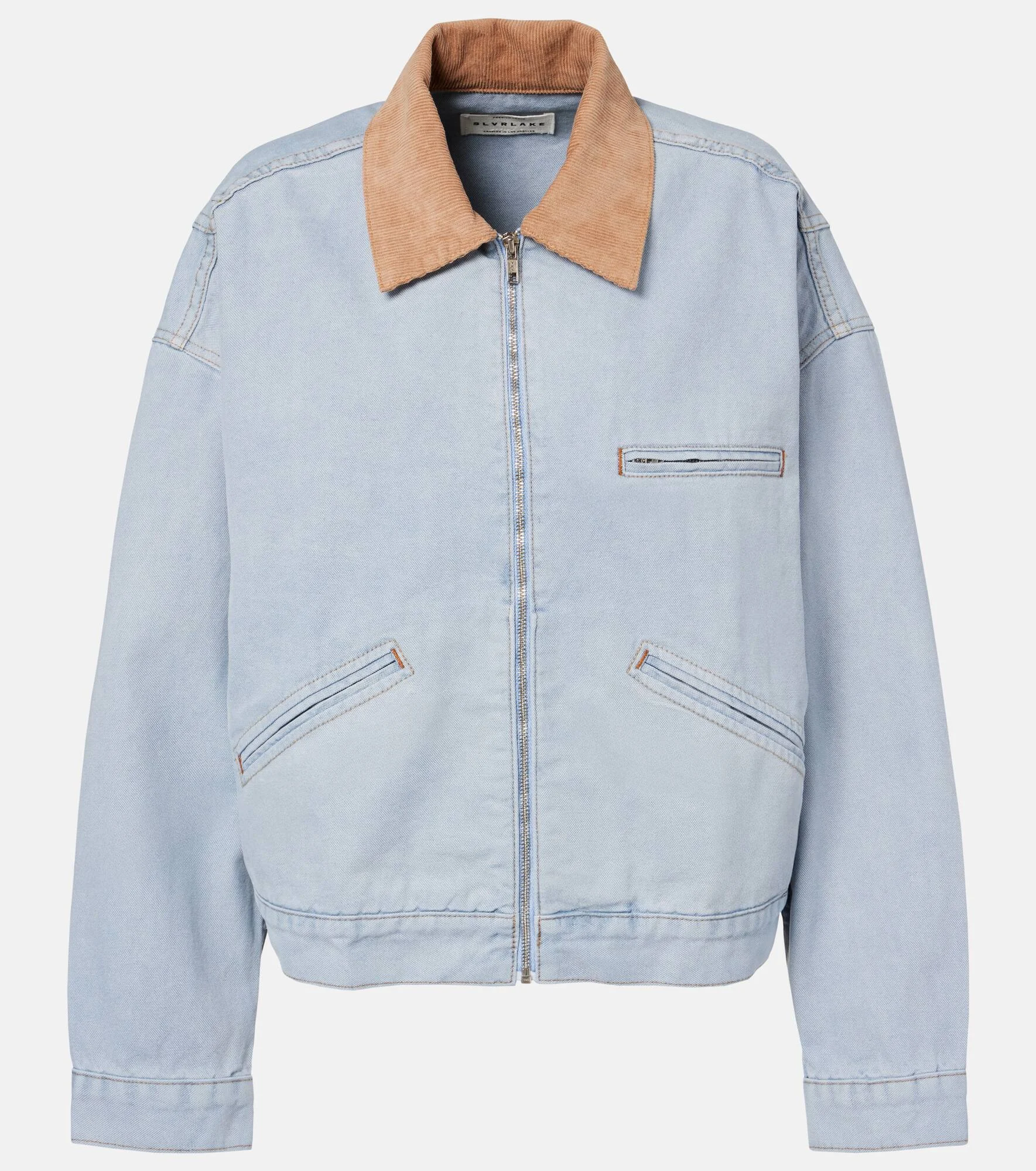 Made from denim, the Camden jacket from SLVRLAKE is a wardrobe essential. Designed with a loose fit, the style features a corduroy collar and is finished with a zipped front fastening. Product Details - Material: 100% cotton - Care instructions: machine wash cold - Made in the USA - Designer color name: Mirror Lake - Item color: blue, beige - Hardware color: silver - Collar: classic (Straight point) - Closure: zipped front - Pockets: jetted - Cuff: one button - Item number: P01067360 Size & Fit - True to size - Dropped shoulders - Designed for a loose fit - Non-stretchy fabric - Falls to the hip - The model seen in the picture is 178cm-5'10" and wearing a size XS