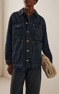 Louise and Gary Edgley founded SLVRLAKE to provide denim lovers with premium options designed with California's effortless sensibilities. This workwear-inspired jacket has an oversized fit made from dark-wash non-stretch denim with front patch pockets. PRODUCT DETAILS - Fall '25 - Button fastening - Composition: 100% cotton - Designer color: Shakey Ground - Machine wash - Made in the USA