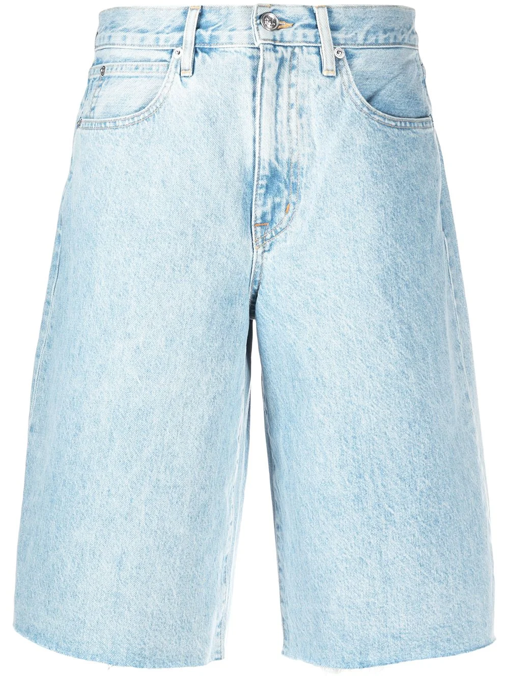 Grace knee-length denim shorts light-blue cotton high waist belt loops front button and zip fastening classic five pockets above-knee length raw-cut hem Made in United States Composition Cotton 100% SIZE & FIT Model measurements Height 5 ft 10 in(1.78 m) Bust/Chest 31.49 in(80 cm) Hips 36.22 in(92 cm) Waist 25.59 in(65 cm) Measurement FRONT RISE 11.02 in(28 cm) HIPS 70.86 in(180 cm) FittingInformation This piece fits true to size. We recommend you get your regular size Designed to be fitted at the waist and hips, loose over the leg Made with a mid-weight non-stretch fabric Washing instructions Machine Wash
