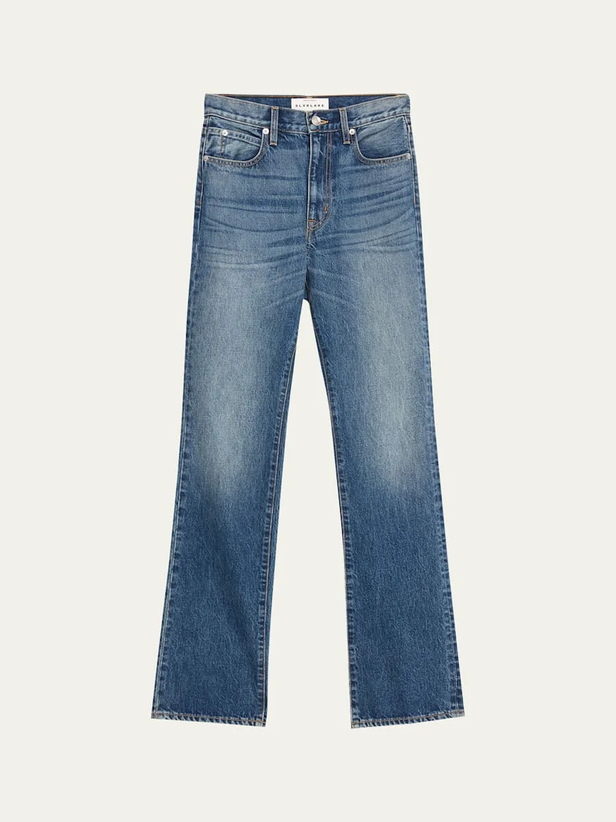 SLVRLAKE "Jade" bootcut jeans crafted from faded, rigid denim Approx. 34" inseam High rise Fivepocket style Slim fit Full length Button/zip fly; belt loops Cotton Machine wash cold Made in USA from imported materials