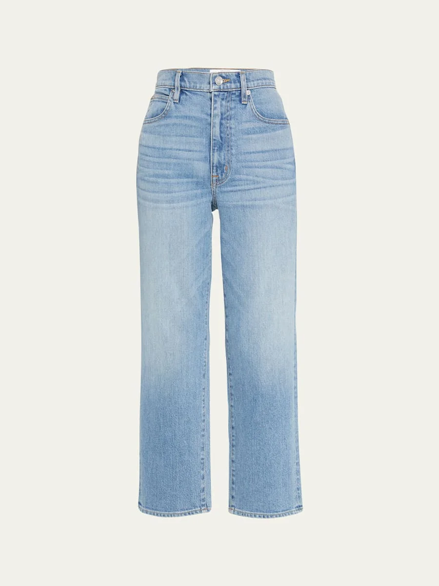 SLVRLAKE "London" denim jeans with whiskering and fading. Five-pocket style. Mid rise. Flat front. Straight legs. Cropped length. Button/zip fly; belt loops. Cotton/spandex. Made in USA of imported material. Online Inquiries: BGS21_T3CEC| Store Inquiries: #3418474