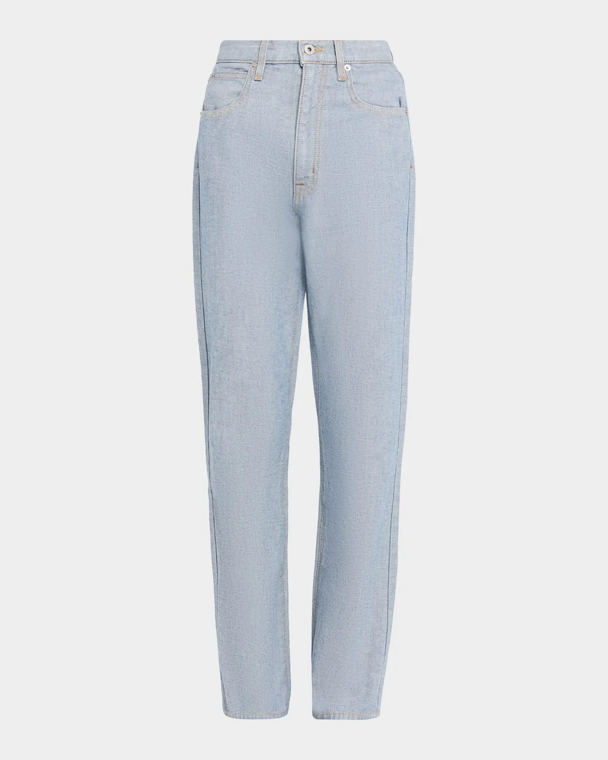 SLVRLAKE "London" jeans in denim. High rise. Fivepocket style. Straight legs. Ankle length. Button/zip fly; belt loops. Cotton/spandex. Made in USA.