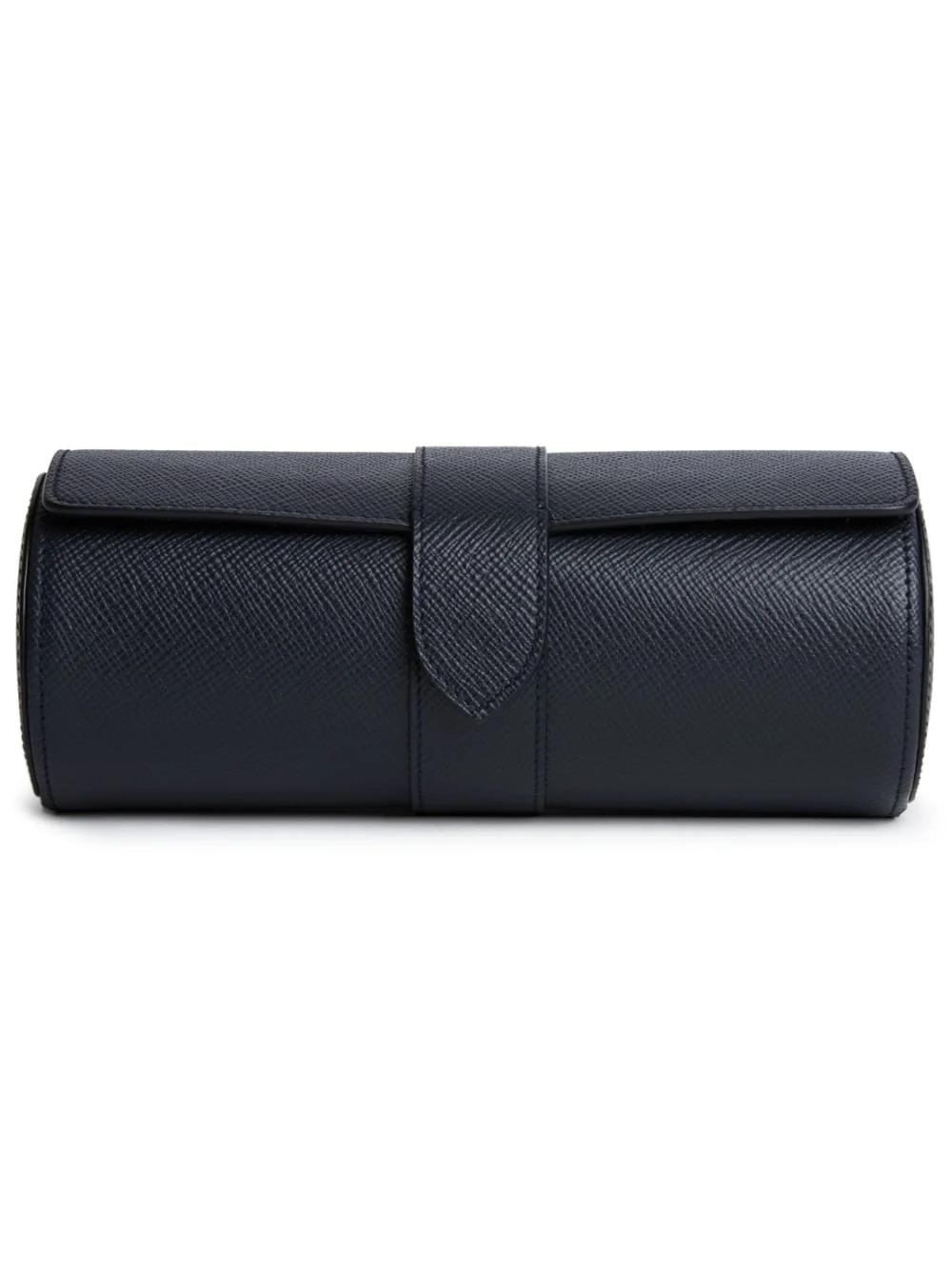 Panama leather 3-watch roll The British brand Smythson presents its 'Panama' collection, combining hardwearing cross-grain leather with a heritage-inspired design. Based on the texture of leather used in the famous Panama diary, the material reappears in the construction of this watch roll, paired with nubuck lining and a removable pad for practical storage. Highlights - Navy blue - Calf leather - Gold-tone logo lettering - Removable pads - Foldover top with magnetic fastening - Suede lining - Holds 3 watches Made in Italy