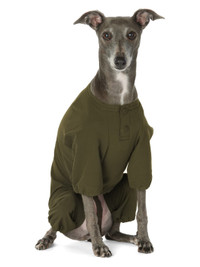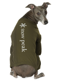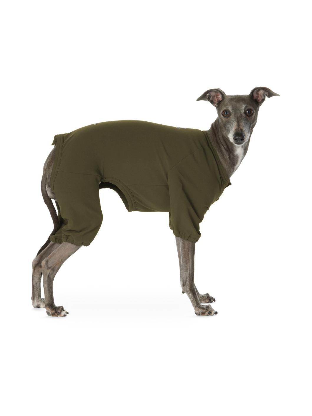 Long sleeve stretch nylon-blend bonded jersey jacket in khaki. Reflective logo in silver-tone at back. - Concealed zip closure - Press-stud fastening at collar - Unlined Name: Brigitte Size Worn: L Breed: Italian Greyhound Weight: 11.6 lb Supplier color: Olive Size: Weight S: 4.8-6.1lbs / 2.2-2.8kg M: 6.1-8.4lbs / 2.8-3.8kg L: 8.4-11.6lbs / 3.8-5.3kg