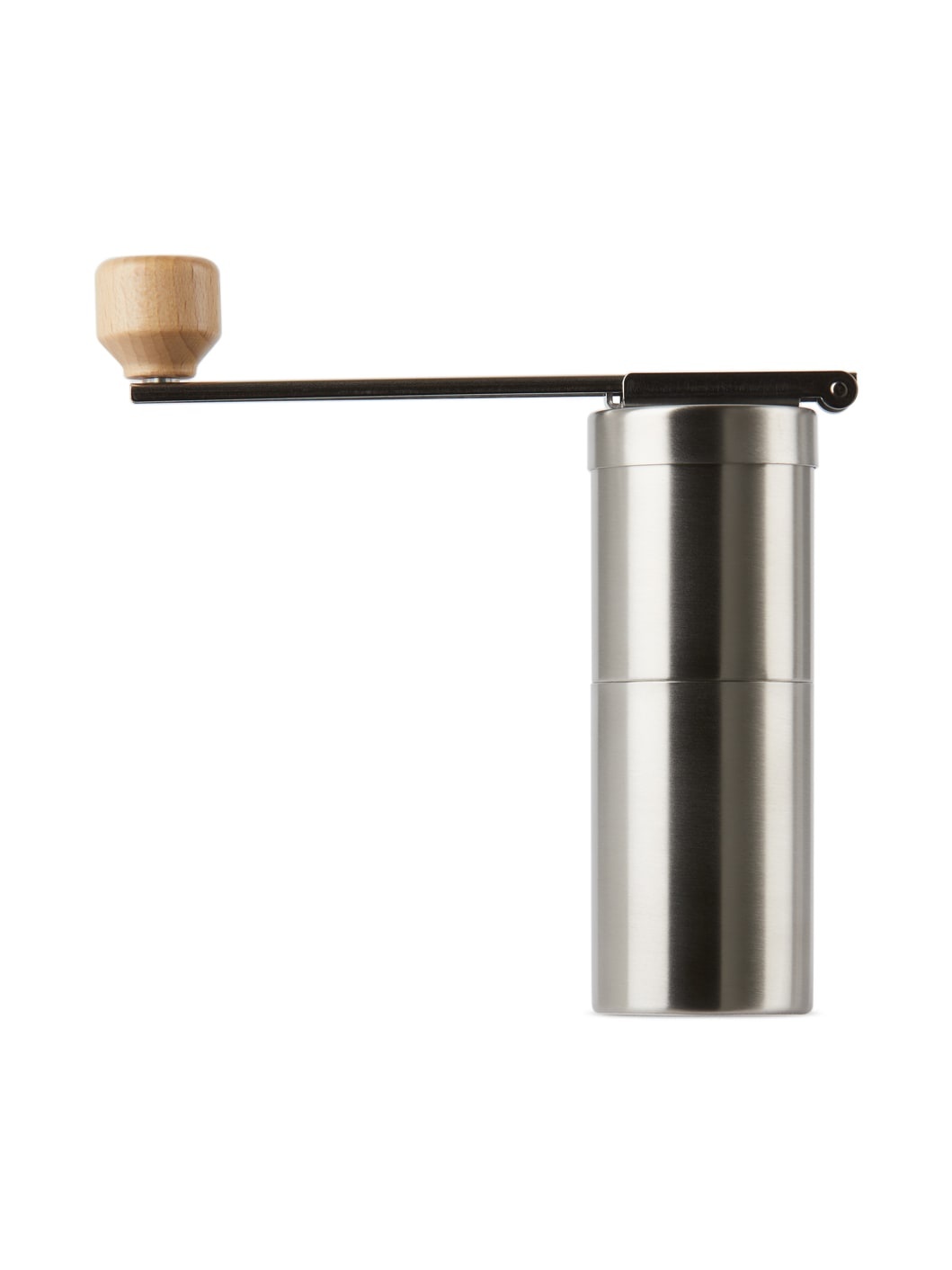Collapsible stainless steel coffee grinder. Adjustable ceramic burr. Turn handle featuring engraved logo and wood knob. Logo engraved at base. - 30 g capacity - Includes textile pouch - H6.3 x L6.3 x W1.89 in / 8.86 oz Supplier color: Silver