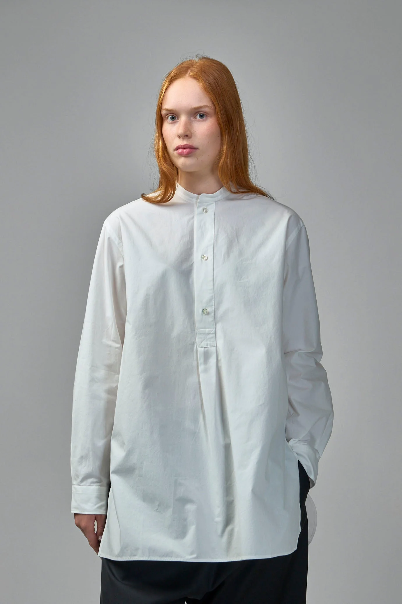 Shirt in a long, oversized tunic silhouette with a mandarin collar and a half-button placket. It features long sleeves with buttoned cuffs, a front box pleat, side slits and a gently rounded hem. Materials: 100% Cotton Color: white SKU: 152820 Brand style: w25-baselitz-cwap-01 Size and Fit The model is 1.80m (5.9ft) and wears a size 38. The item has a looser cut but is not necessarily oversized. It’s intended for a comfortable and easy wear.