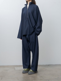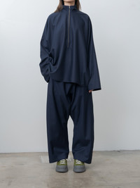 The Carracci Pullover is an oversized zip pullover crafted from a lightweight, super 110s suiting wool. It features a half-zip front closure, a stand collar, elongated sleeves, and a clean finish hem at the cuffs and hem. Coordinating piece with Plof Trousers in Admiral. - Made in the EU - 100% Wool 110s - Available in Charcoal Melange, Admiral - The model is 5'8"/173cm and wears size 36/S - Oversized fit - we recommend sizing down