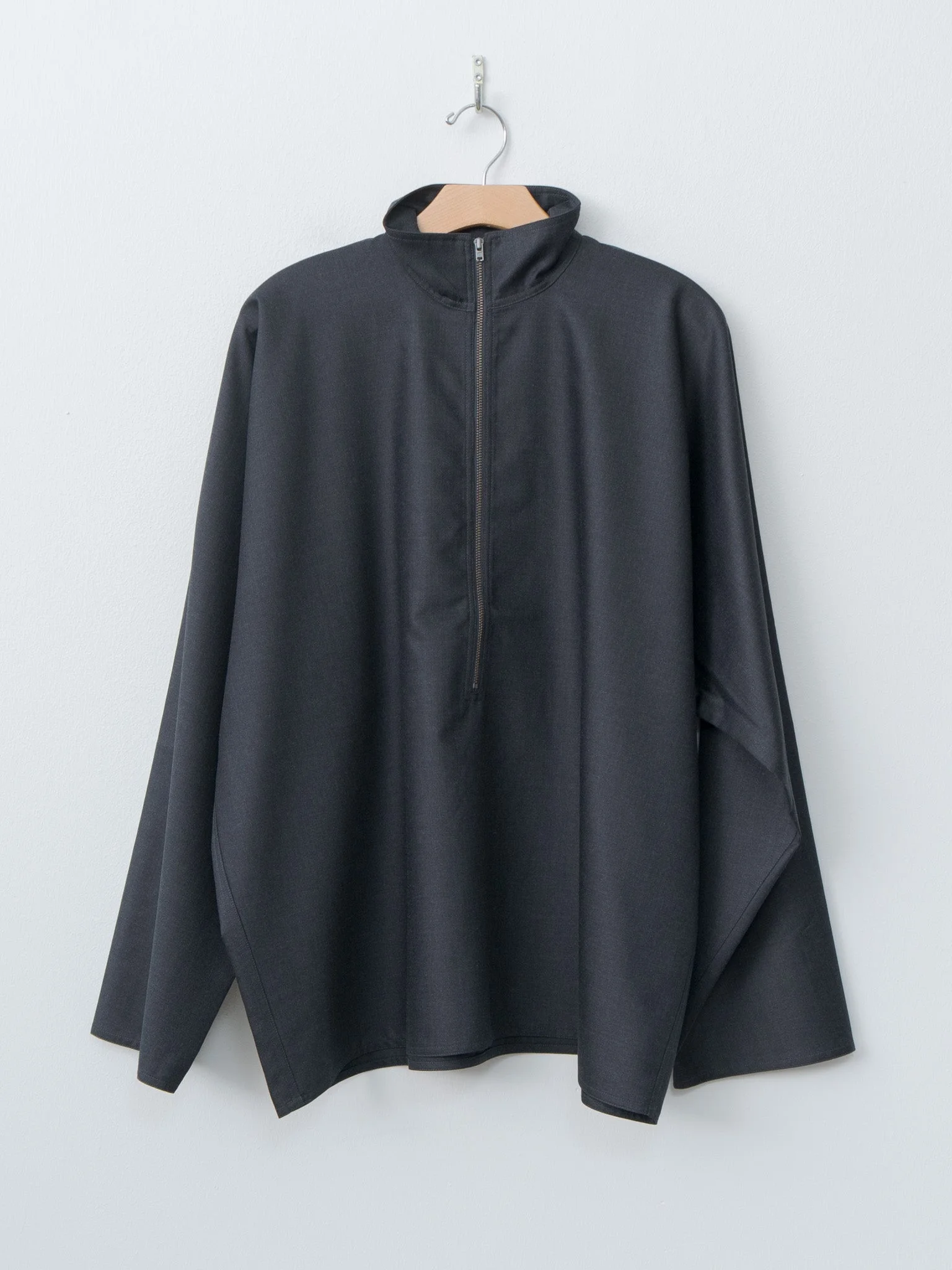The Carracci Pullover is an oversized zip pullover crafted from a lightweight, super 110s suiting wool. It features a half-zip front closure, a stand collar, elongated sleeves, and a clean finish hem at the cuffs and hem. Coordinating piece with Plof Trousers in Charcoal Melange. - Made in the EU - 100% Wool 110s - Available in Charcoal Melange, Admiral - The model is 5'8"/173cm and wears size 36/S - Oversized fit - we recommend sizing down