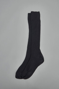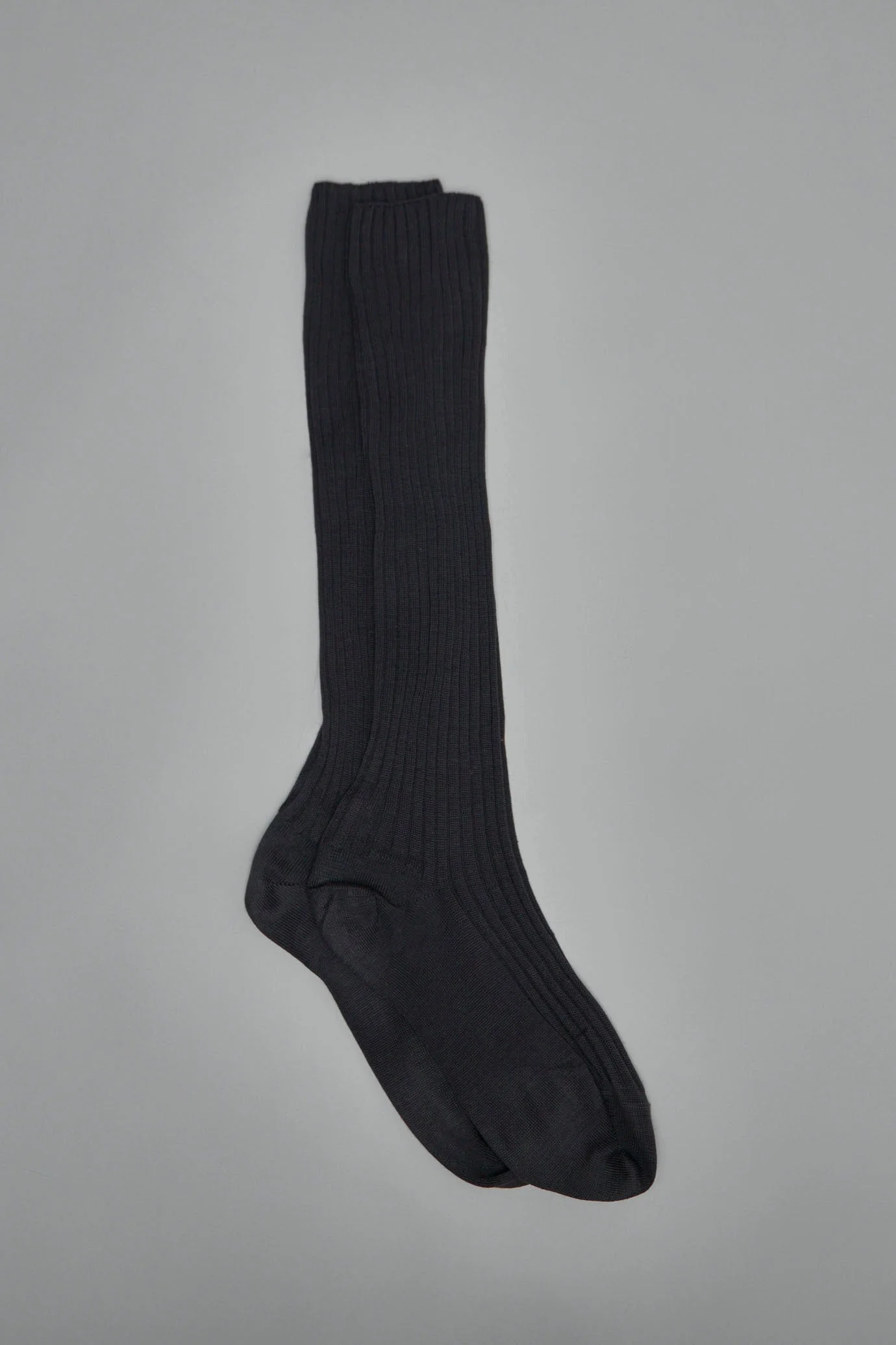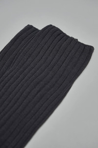 Pair of socks in a ribbed knit, shown laid flat. They are knee-high, solid black with visible heel and toe shaping. Materials: 100% Cotton Color: monoi SKU: 152819 Brand style: w25-federle-yrib-03