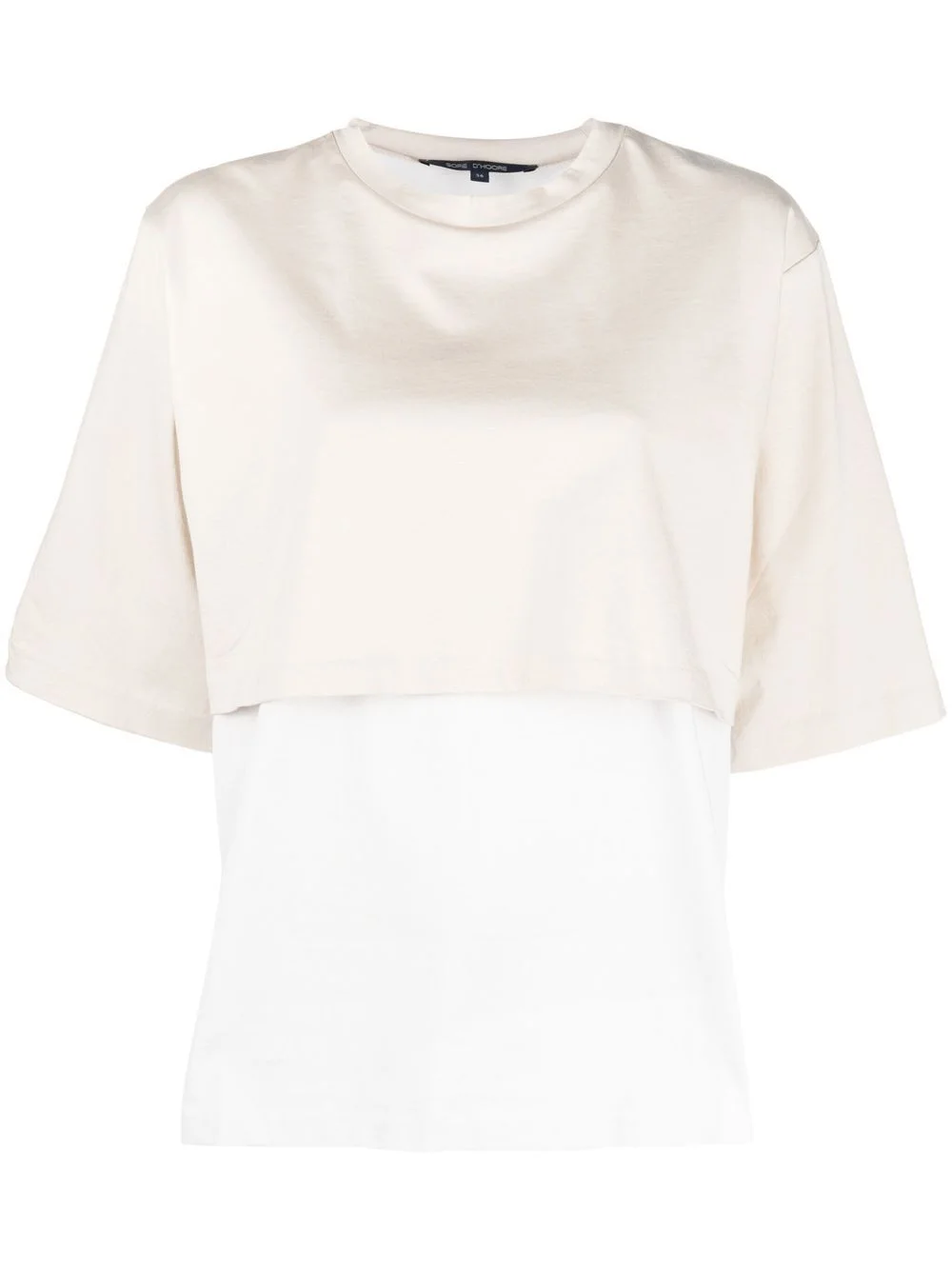 crew neck short-sleeved layered T-shirt beige/white cotton crew neck short sleeves layered design Imported Composition Cotton 100% SIZE & FIT Model measurements Height 5 ft 10 in(1.78 m) Bust/Chest 33.46 in(85 cm) Hips 36.22 in(92 cm) Waist 23.22 in(59 cm) FittingInformation This piece fits true to size. We recommend you get your regular size Cut for a loose fit Made with a mid-weight fabric Washing instructions Machine Wash