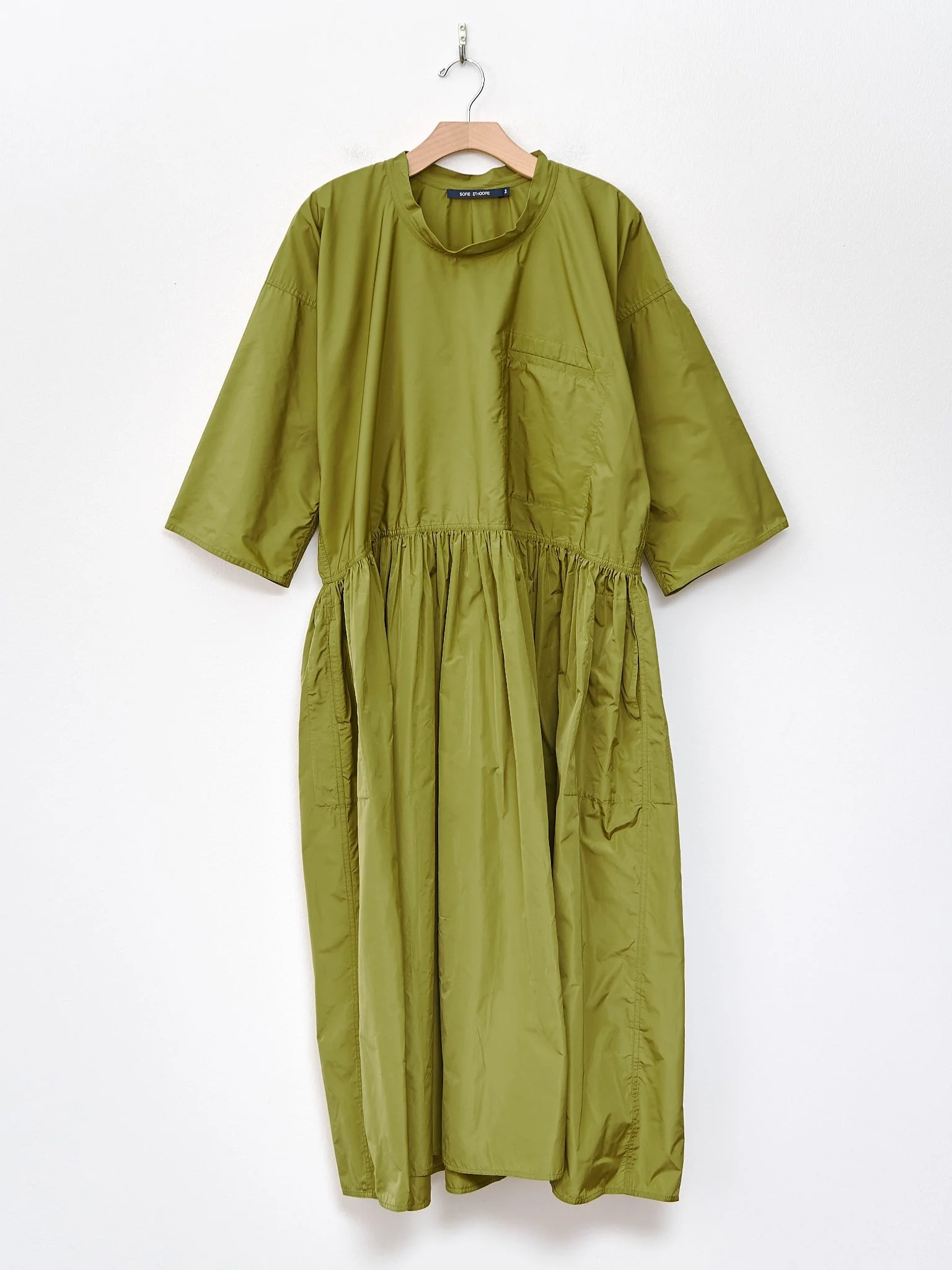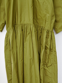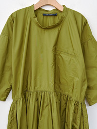 We are so excited about the Delos dress from Sofie D'Hoore. At first glance, the poly taffeta may seem reserved for special occasions, but in true Sofie fashion, she makes taffeta work for everyday wear. This easy drop waist dress features a rounded, slightly raised neckline, dropped shoulders, roomy 3/4 sleeves that can be rolled up, a chest pocket, and side pockets. The poly taffeta is smooth and lightweight with an elegant sheen. - Made in Bulgaria - 100% Polyester - Available in Curcuma (orange), Touareg (blue navy), and Olive Oil (green) - Model is 5'7/170cm and wears size 34/XS