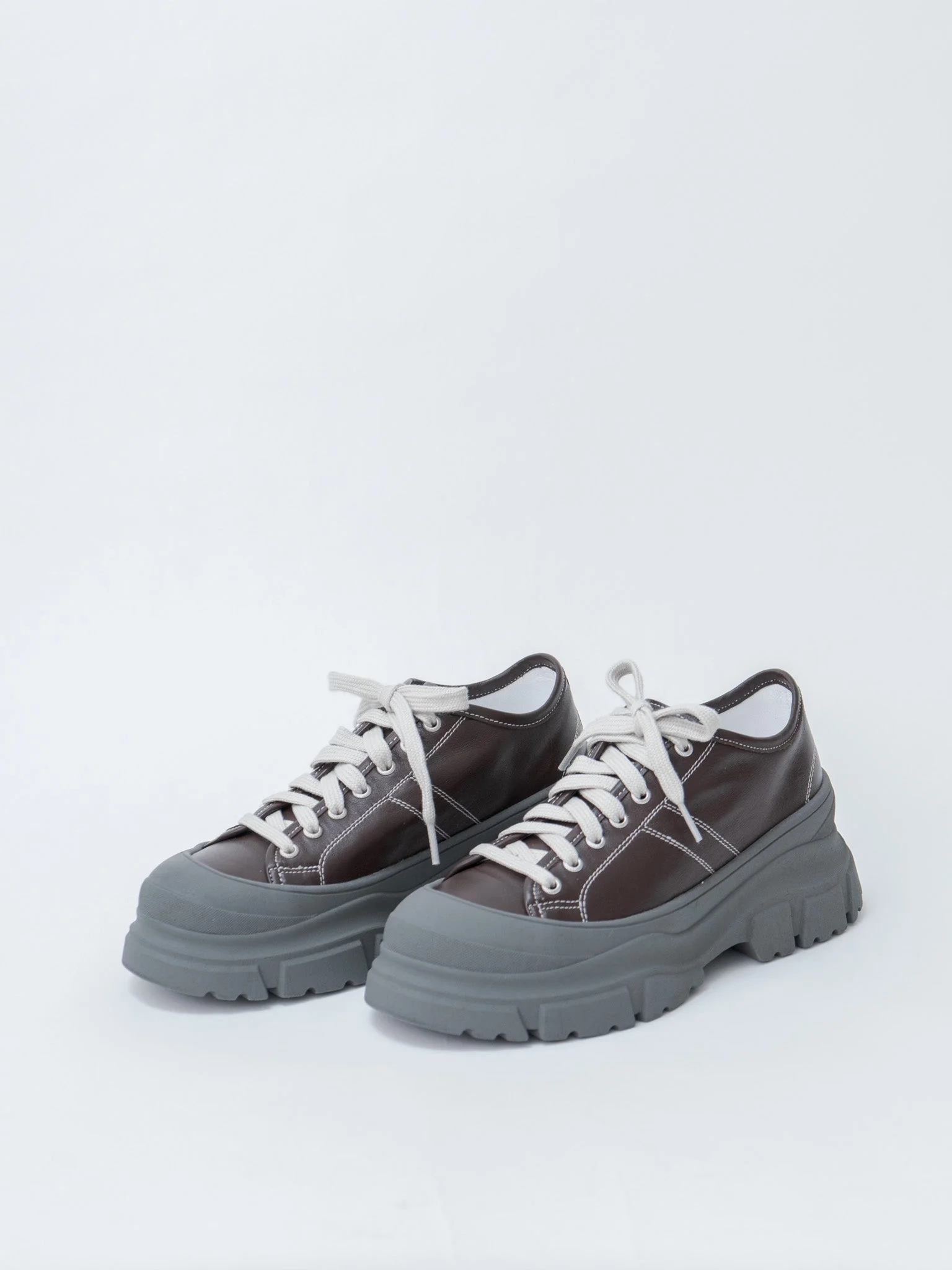 Sofie D'Hoore's signature chunky sole sneakers. These low-tops feature a smooth nappa leather upper, a chunky rubber sole and toe cap and contrast stitching. - Made in Italy - Smooth Nappa Leather Upper - Available in Cacao with Slate Outsole and Black with Camel Outsole - We recommend sizing up if in between sizes