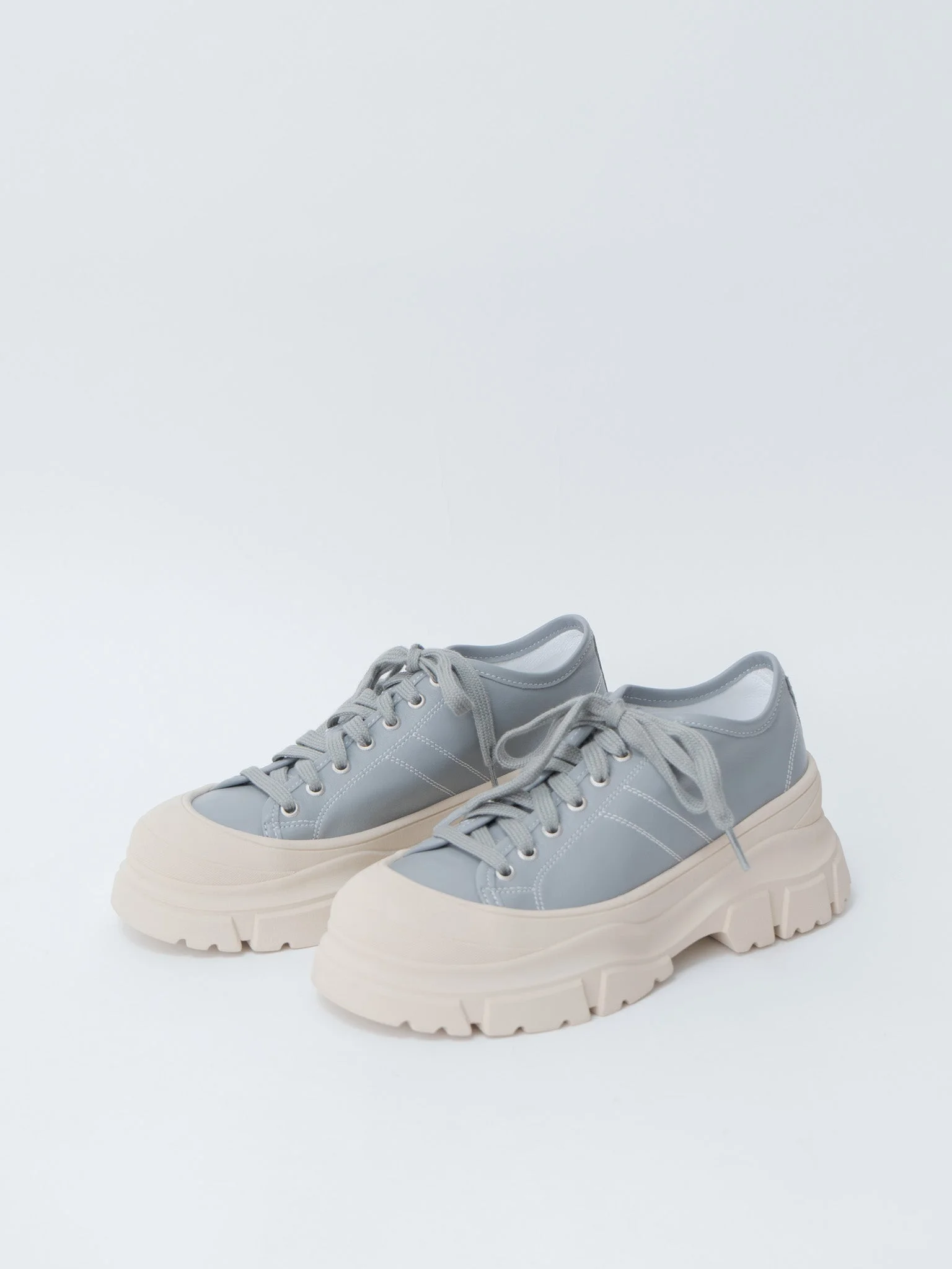 A bold chunky sneaker from Sofie D'Hoore. These leather sneakers feature a low-top, a smooth nappa leather upper, a chunky rubber sole and toe cap, and constrast stitching. - Made in Italy - 100% Nappa Leather - Available in Gray upper, Mastic (off white) outsole - EU sizing - runs true to size. For wide feet or in between sizes, we recommend sizing up