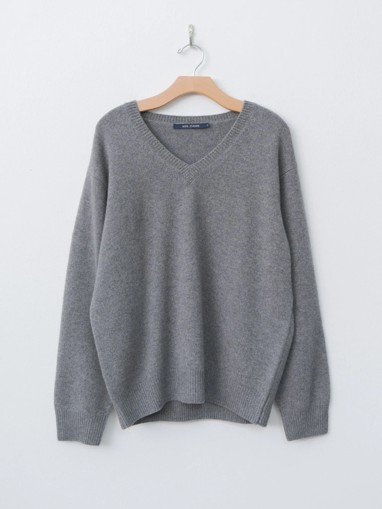 The Mann Sweater is an oversized V-neck style crafted from soft and plush 3-ply cashmere. It features dropped shoulders and ribbed detailing at the neckline, cuffs, and hem. It is designed to be worn long and loose or styled with the hem at the hips. - Made in Belgium - 100% Cashmere - Available in Midnight and Mid Grey Melange - The model is 5'7"/170 cm and wears size S